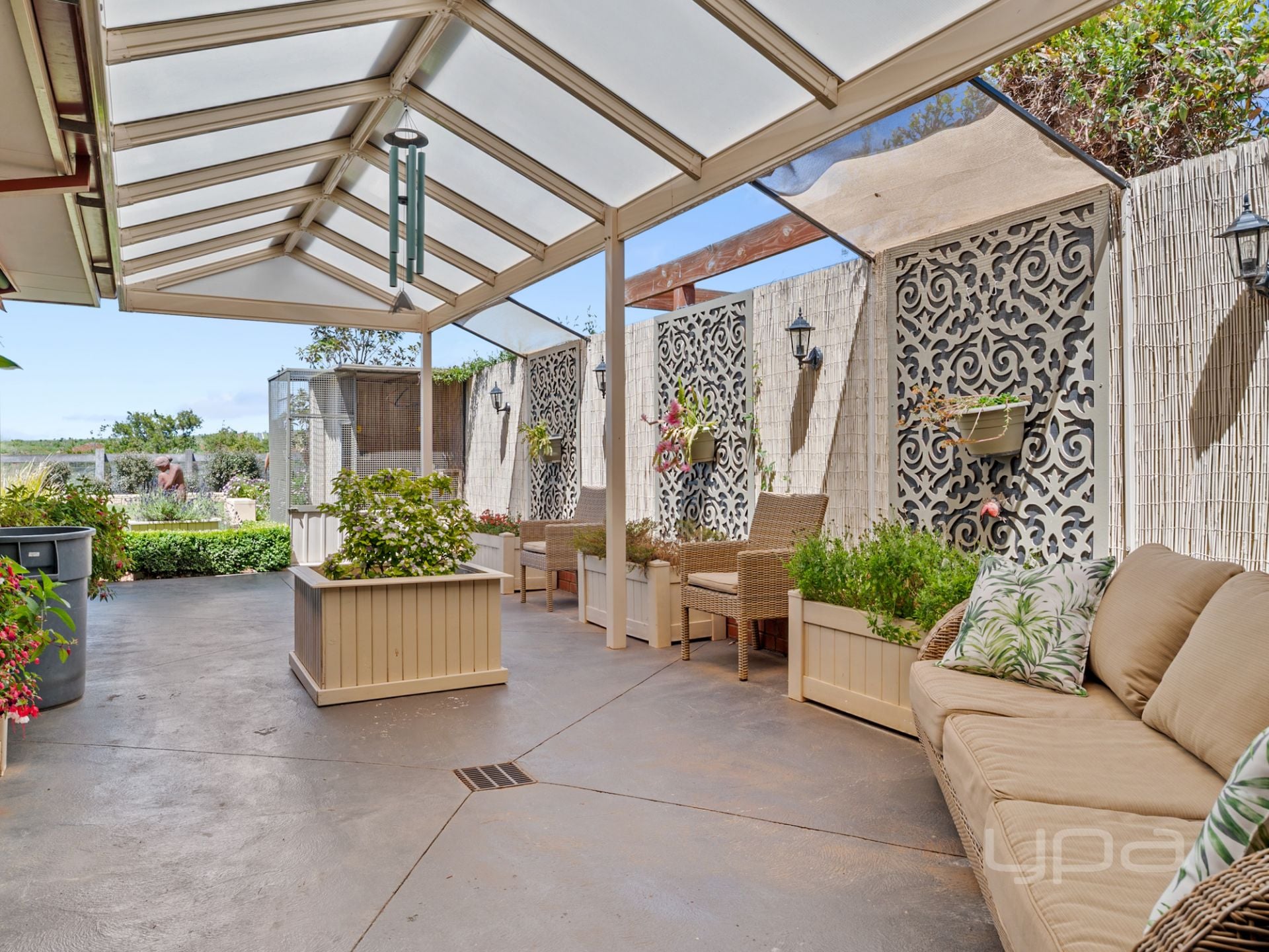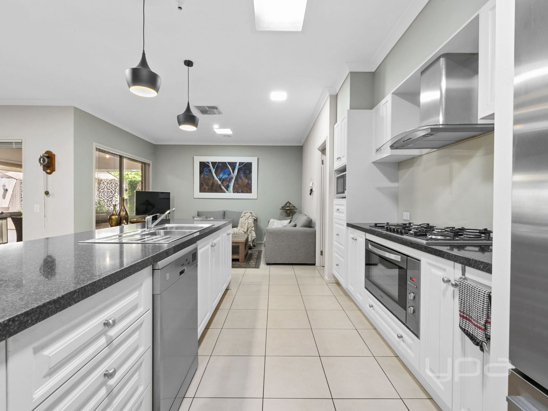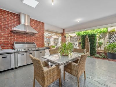 Outside, entertaining is effortless with a huge under-roof alfresco accessed through triple stacker doors. Complete with rangehood, skylights, and bistro blinds, this space can be enjoyed year-round. Drive-through access from the garage also allows for additional parking.