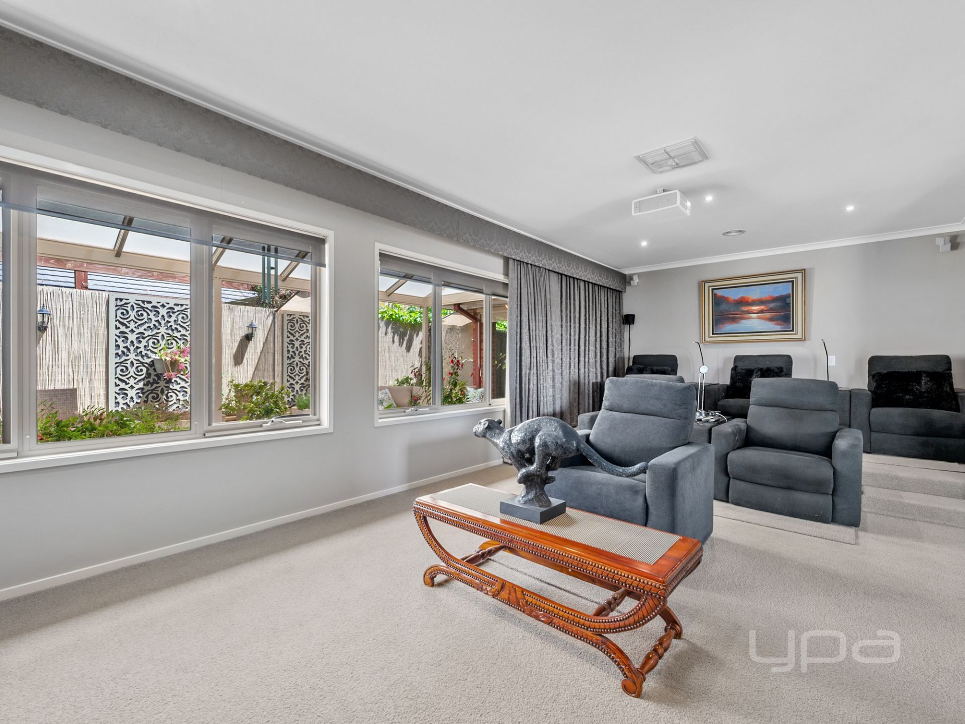 The generous rumpus room is perfect for family enjoyment—ideal as a billiard room, extra lounge, or children's playroom. A dedicated theatre room elevates home entertainment to the next level, featuring a projector, screen, tiered seating steps, sliding doors, sheer blinds, and block out drapes for the ultimate cinema experience.