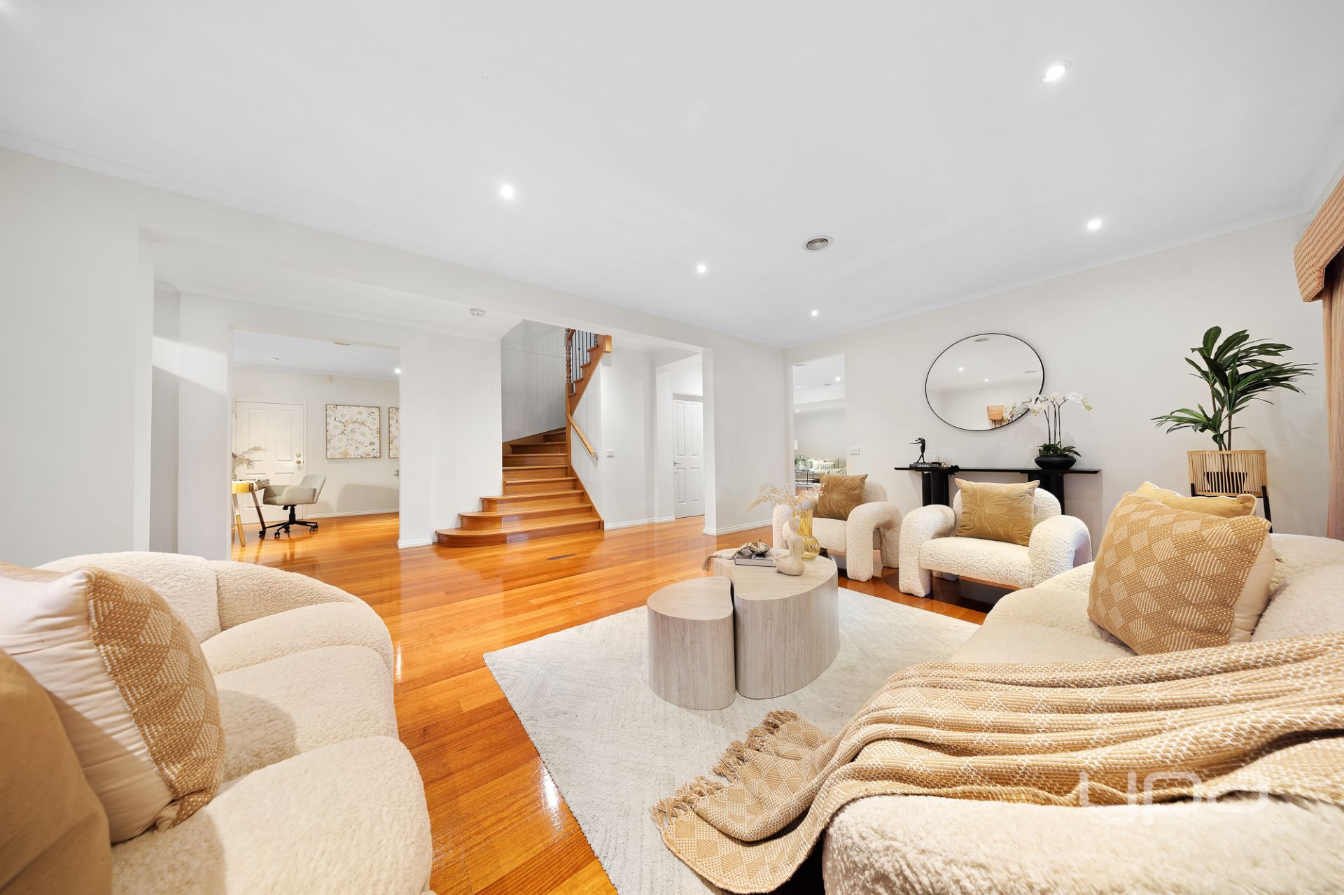 From the moment you arrive, the home's commanding street presence and welcoming façade set the tone for what lies within. Stepping inside, you are greeted by a wide and impressive entrance that immediately evokes a sense of scale and warmth. Rich timber flooring flows throughout the lower level, enhancing the feeling of quality while drawing you into a thoughtfully designed layout that unfolds beautifully from front to rear.