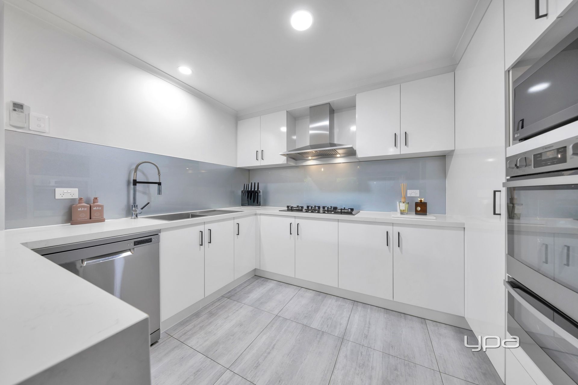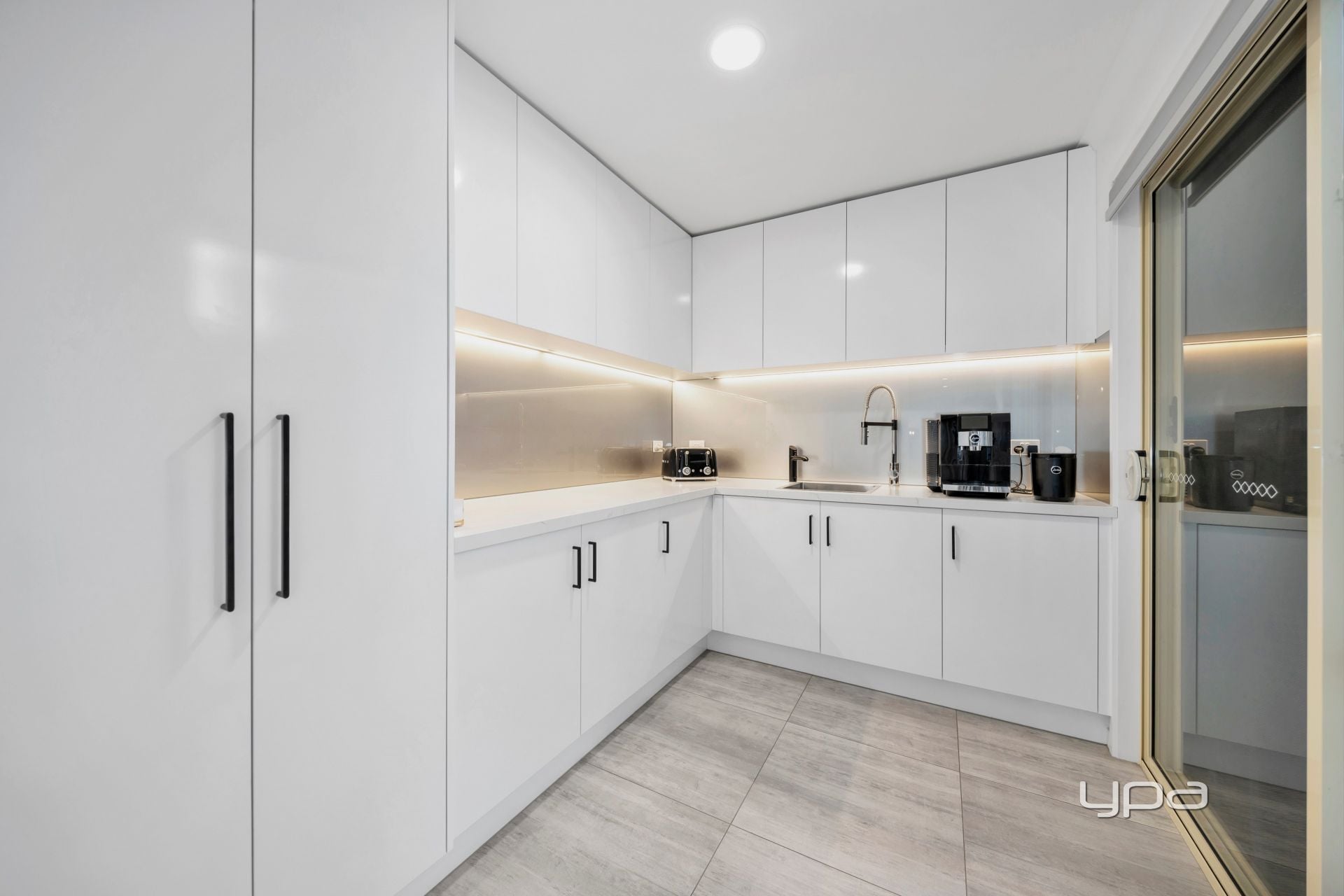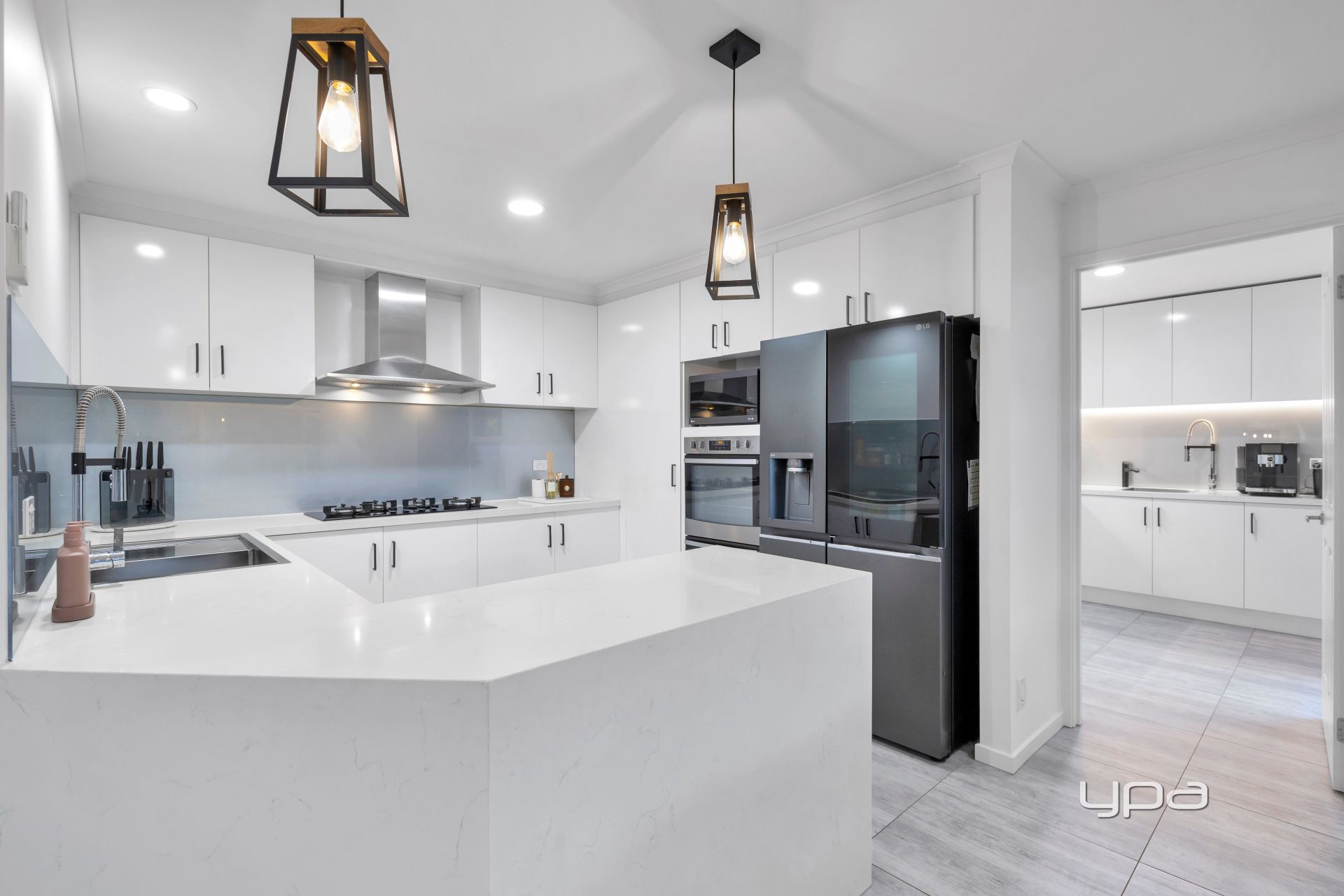 • Designer kitchen complete with butler's pantry, plumbing behind the fridge, 40mm Caesarstone benchtops, glass splashback, ample cabinetry, 900mm gas cooktop, rangehood, wall oven, and dishwasher