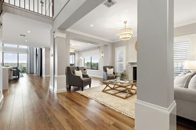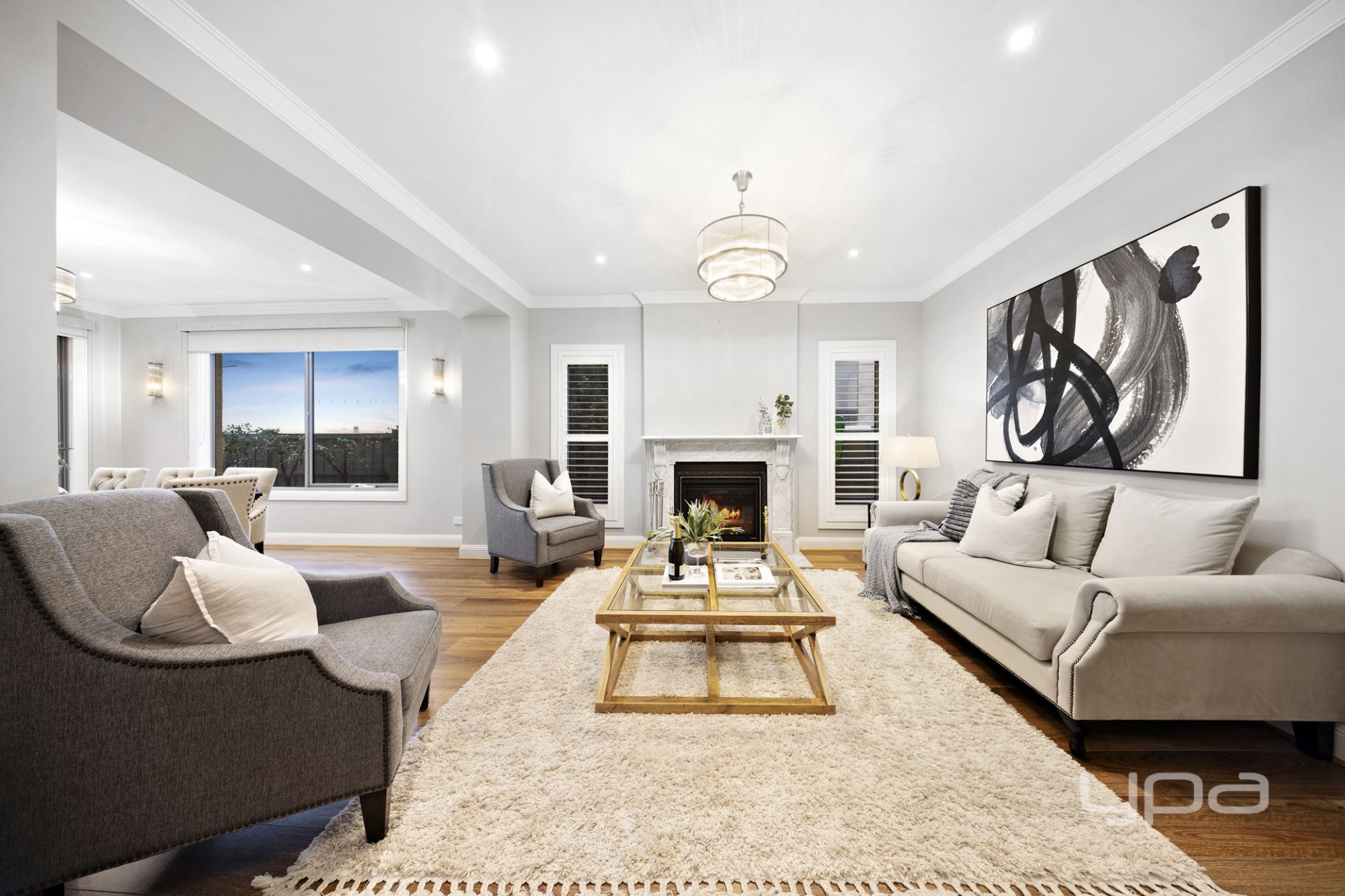 Adjacent is a formal lounge, tailored for entertaining and impressing your guests. Centered around a striking feature fireplace, the room is adorned with designer chandeliers that cascade warm light across the elegant space. The ambience here is refined, welcoming, and perfect for intimate conversations or simply enjoying the flicker of the fire.