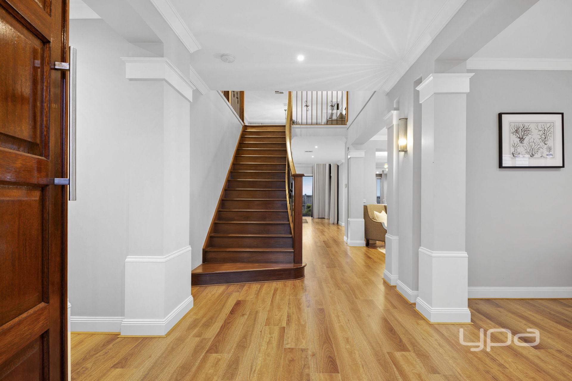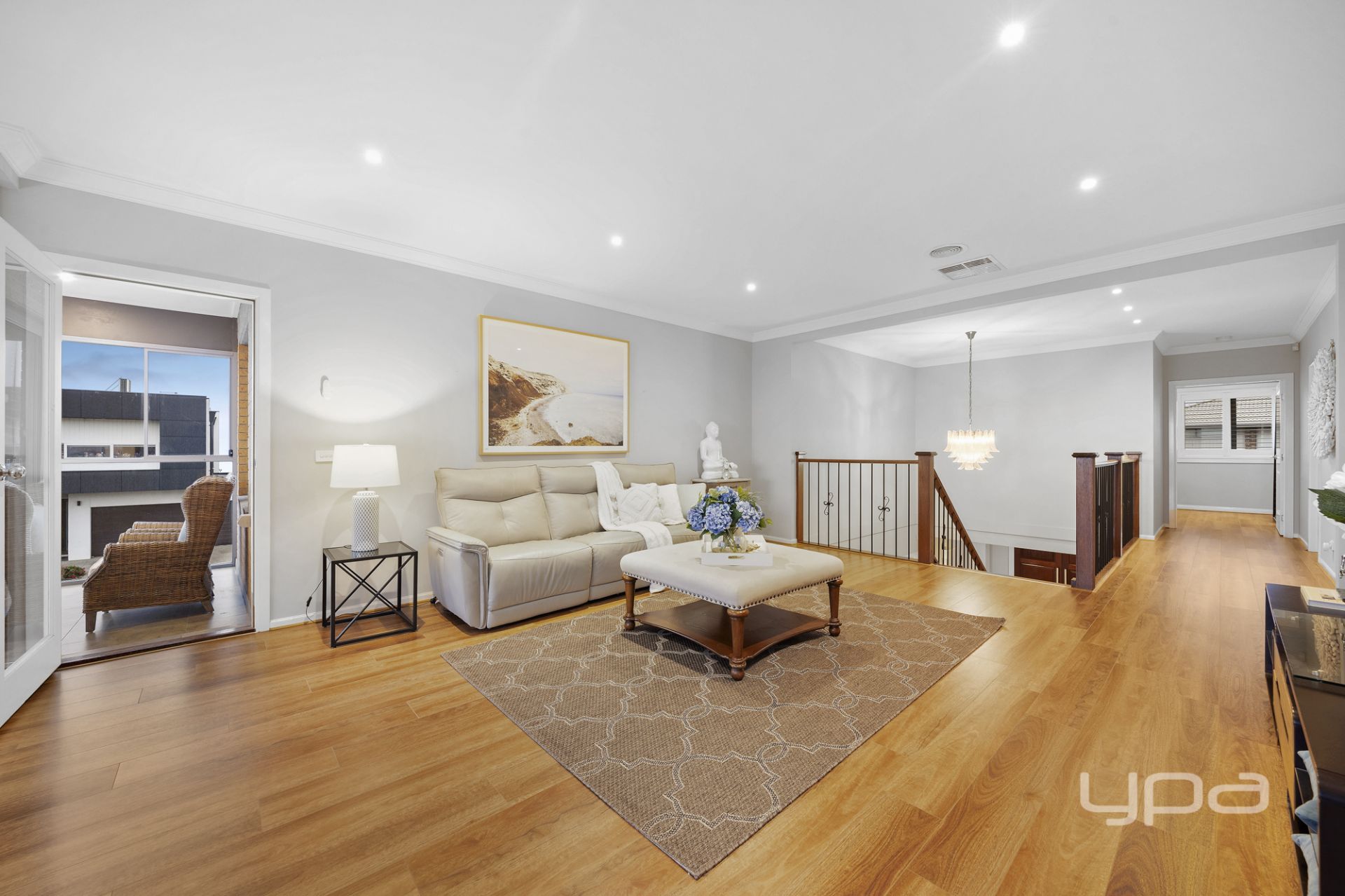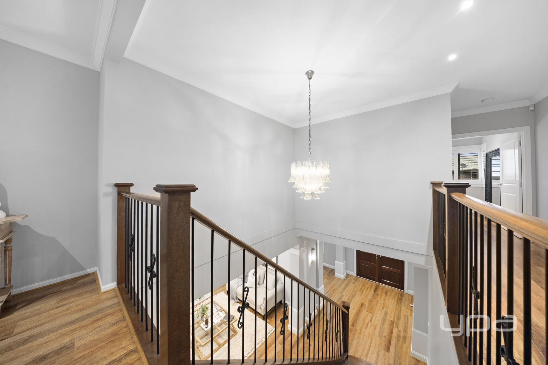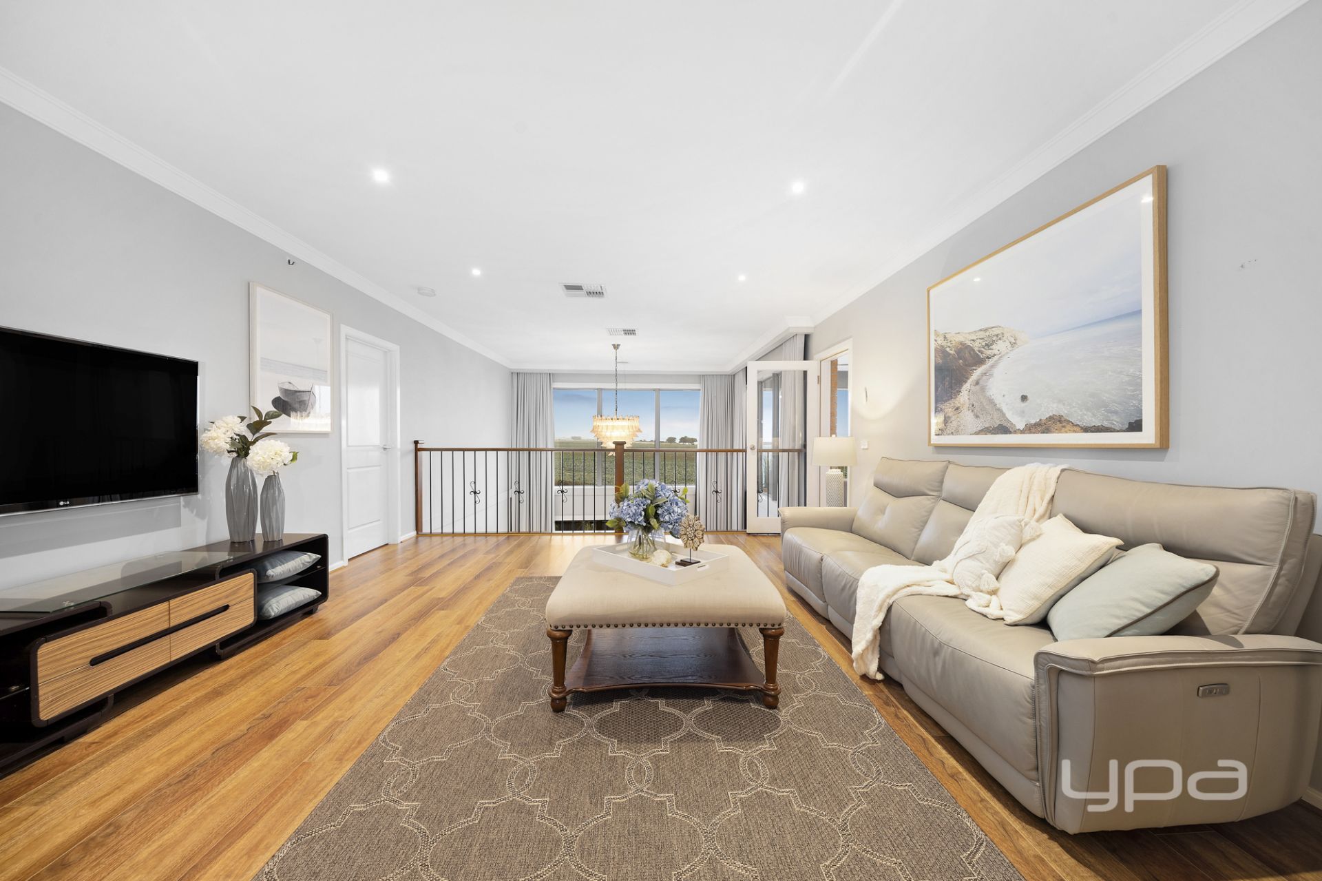 Climb the premium timber staircase and discover the upper level – a sanctuary of peace and indulgence. The upstairs landing features an additional lounge or retreat space, ideal for unwinding, reading, or watching TV in a quieter zone away from the main hub of the home.