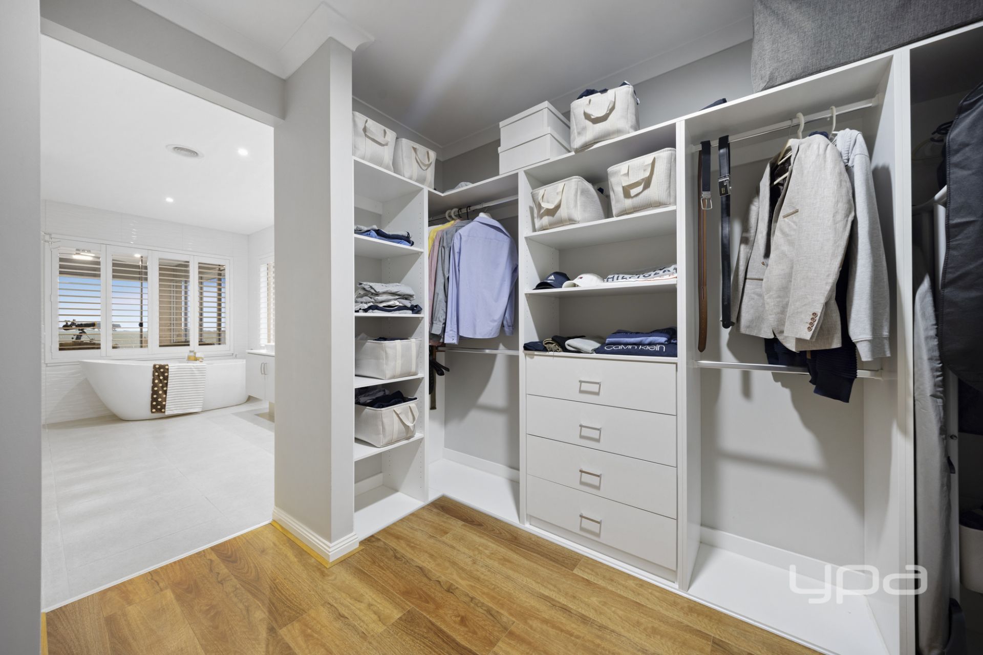 -His and her walk-in robes, fully fitted with custom cabinetry to accommodate all your seasonal wardrobes