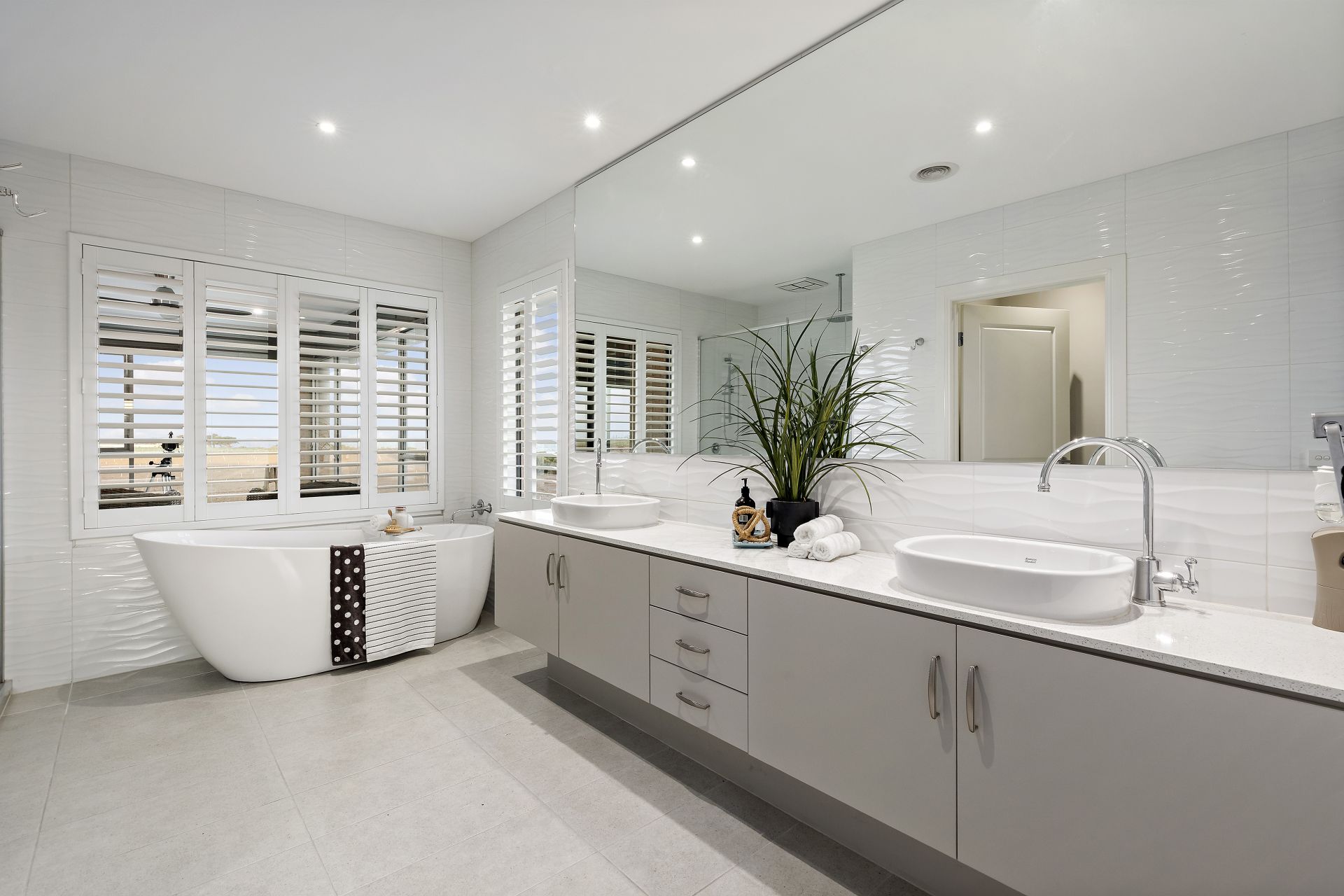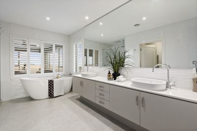 -A lavish ensuite complete with dual vanities, a freestanding designer bath, and an oversized shower – all finished with the finest fixtures and fittings